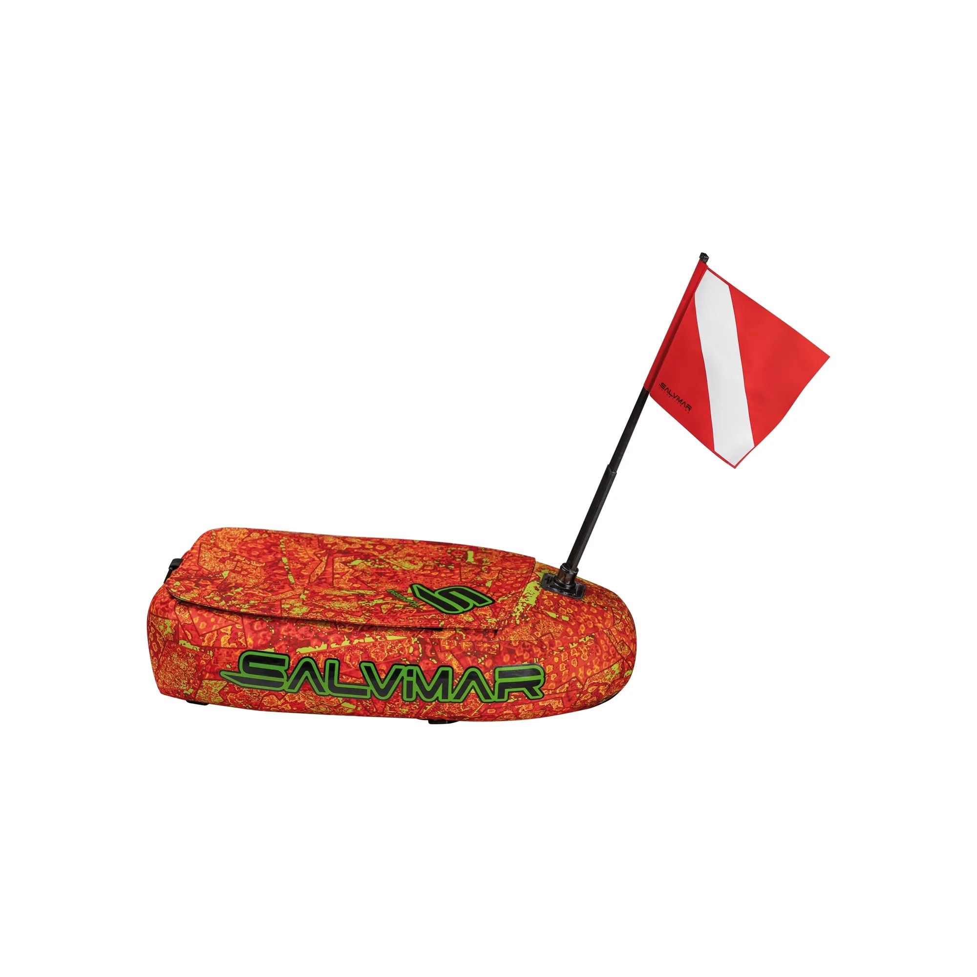 La plancetta gonfiabile è progettata con una camera interna in PVC e un rivestimento esterno resistente in tessuto di nylon ad alta resistenza, che offre una protezione ottimale contro le abrasioni. Il suo colore ad alta visibilità è conforme alle normative di sicurezza, garantendo una facile individuazione in acqua. Le dimensioni della plancetta sono calibrate per fornire una spinta di galleggiamento di 40 kg, rendendola adatta per il trasporto di attrezzature e materiali durante le immersioni. Dispone di un vano porta oggetti con chiusura velcro per la sicurezza degli accessori durante il trasporto. L'asta della bandiera è maggiorata e rinforzata per garantire una visibilità ottimale, mentre la bandierina inclusa rispetta le dimensioni standard. La plancetta è dotata di fasce cucite in cordura per il fissaggio di arbalete, pneumatici e altri oggetti necessari durante l'attività subacquea. Inoltre, viene fornita con una sagola galeggiante da 25 metri.
